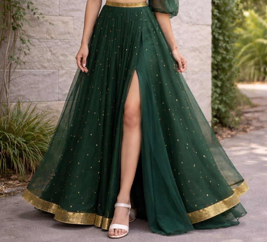The high-waist lehenga flows beautifully with layered flare and subtle gold embellishments, finished with a rich gold border at the hem. Lightweight, elegant, and statement-making — perfect for cocktail parties, receptions, festive evenings, and destination events.