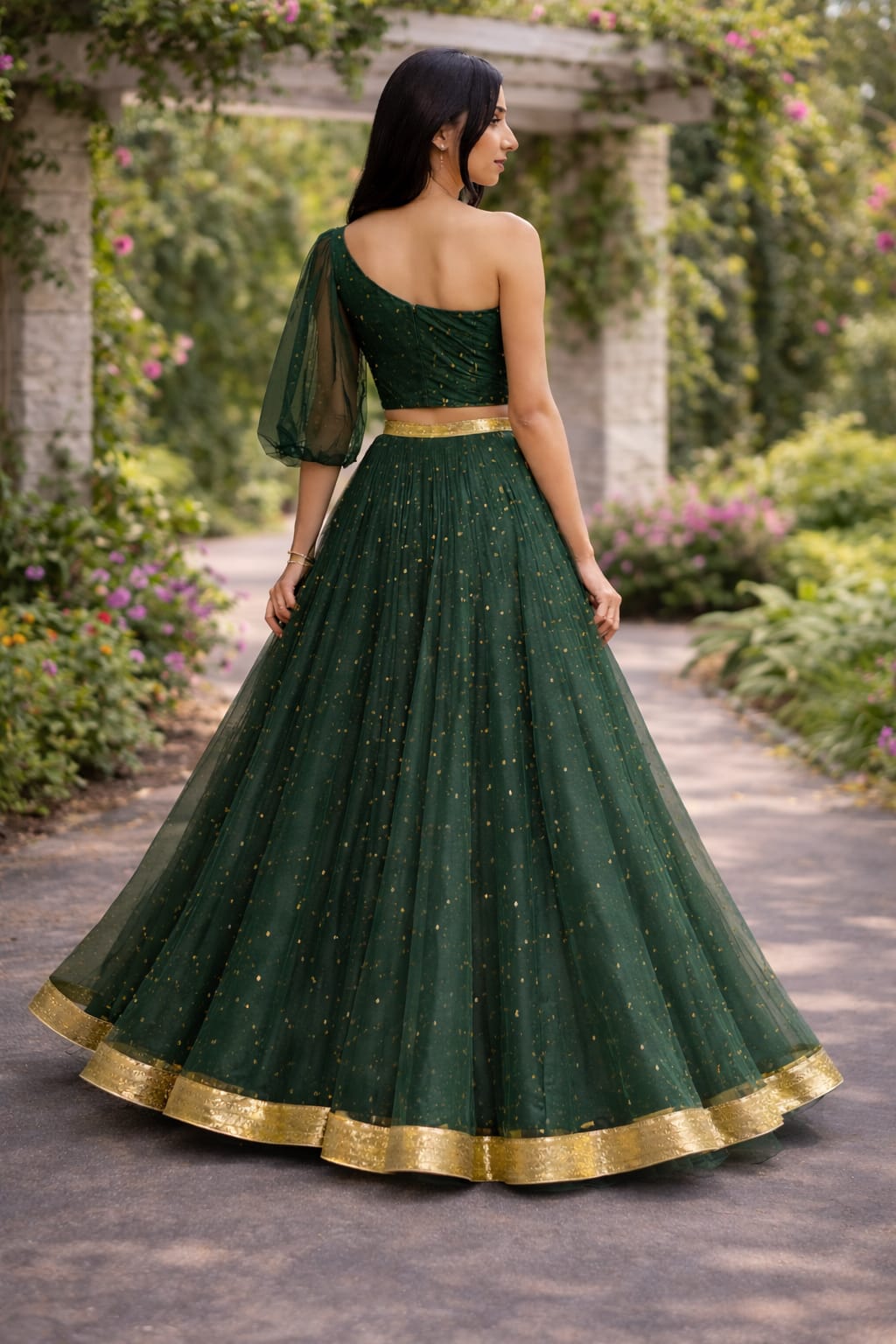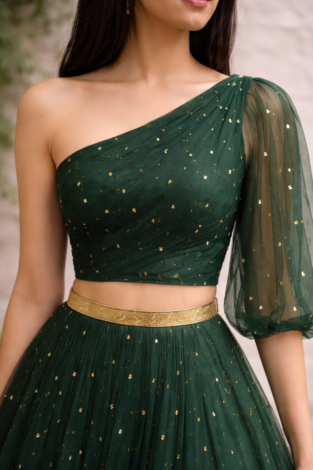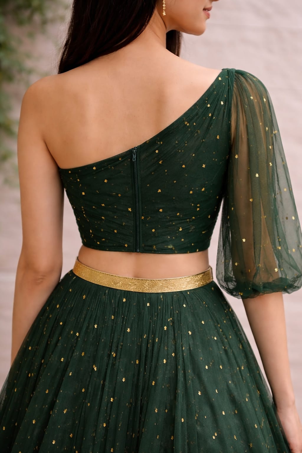 Turn heads in this stunning emerald green one-shoulder lehenga set designed with a modern western touch. The blouse features a structured one-shoulder neckline with a soft sheer sleeve on one side and a clean fitted finish at the back with a concealed zip closure.