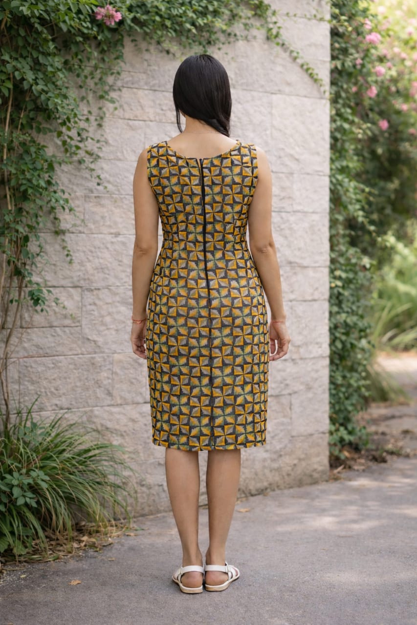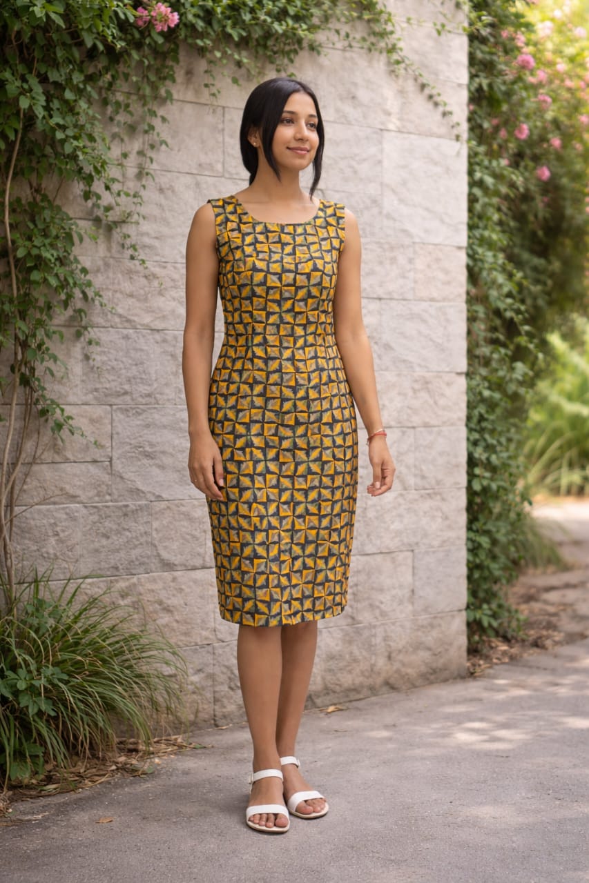 Elevate your style with our Golden Prism Pencil Dress.